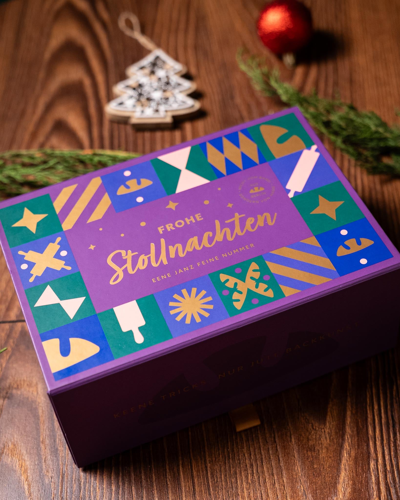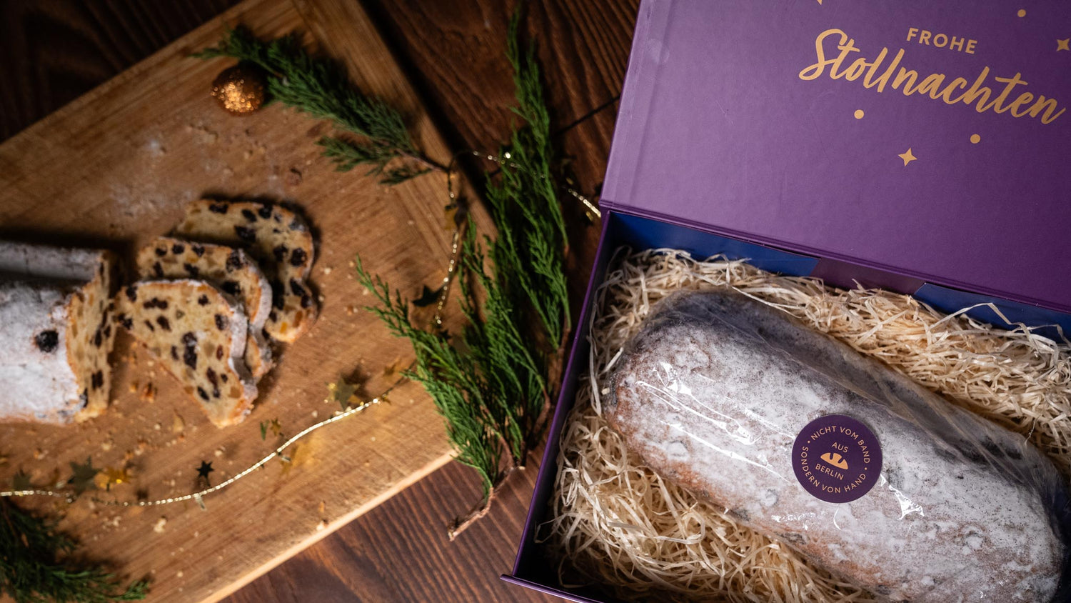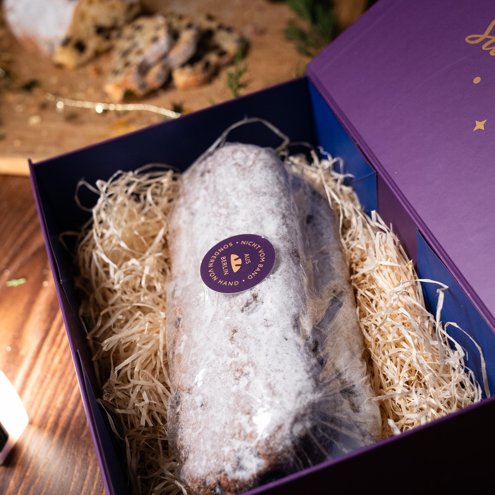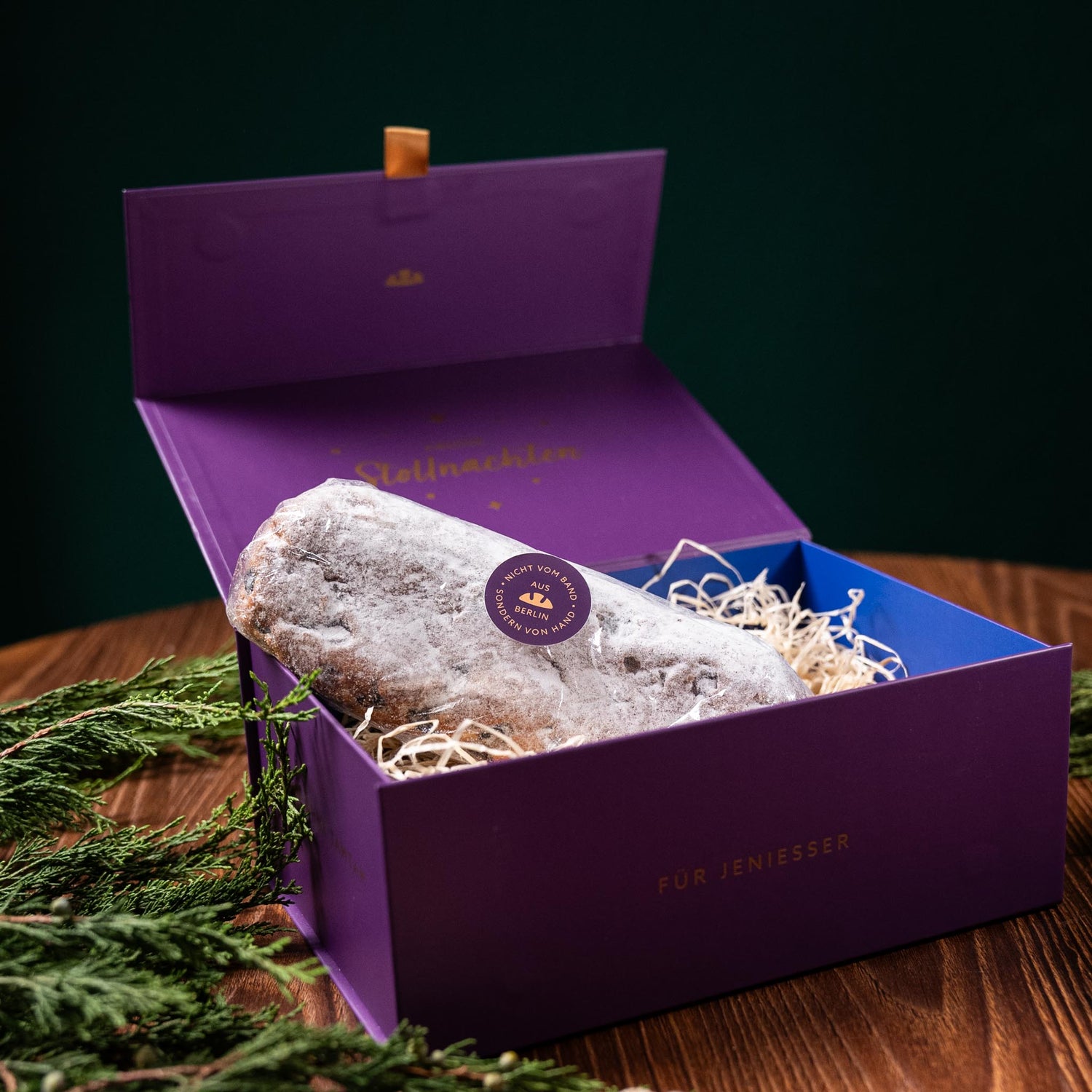 Geschenkbox mit Berliner Flair oder neutraler Stollen für den Eigenversand.